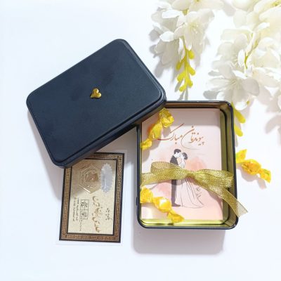 جعبه جنس فلزی درب دار همراه کارت پستال مناسبتی از جنس گلاسه روکش سلفون، مناسب سکه و شمش های کادویی