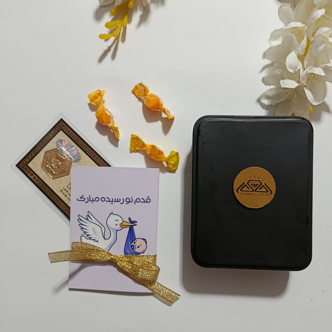 جعبه جنس فلزی درب دار همراه کارت پستال مناسبتی از جنس گلاسه روکش سلفون، مناسب سکه و شمش های کادویی