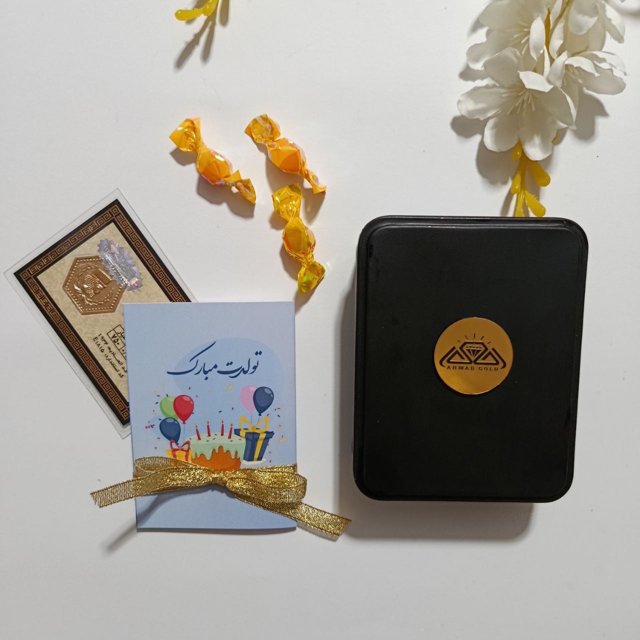 جعبه جنس فلزی درب دار همراه کارت پستال مناسبتی از جنس گلاسه روکش سلفون، مناسب سکه و شمش های کادویی